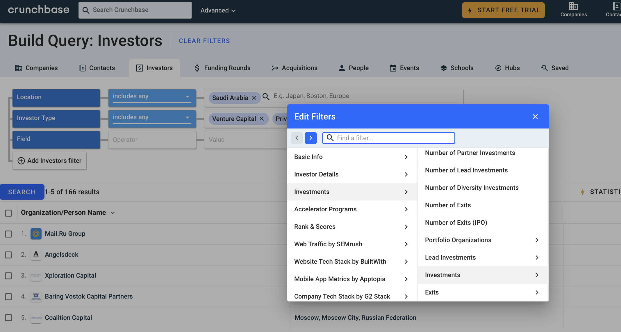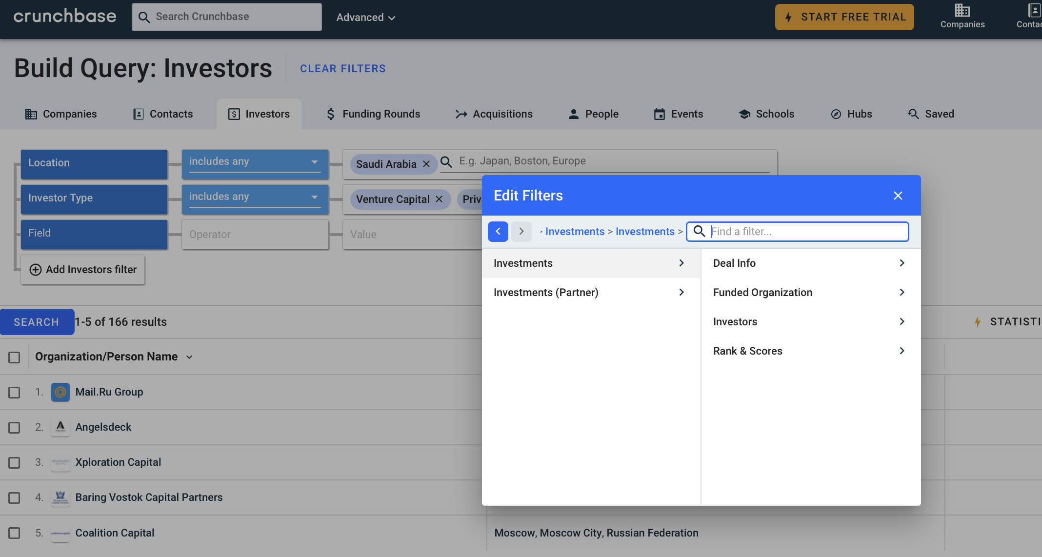 OK, let's use the free version and try to find relevant investors and use Query builder. So we want to find e-commerce PE/VC investors located in Saudi Arabia.