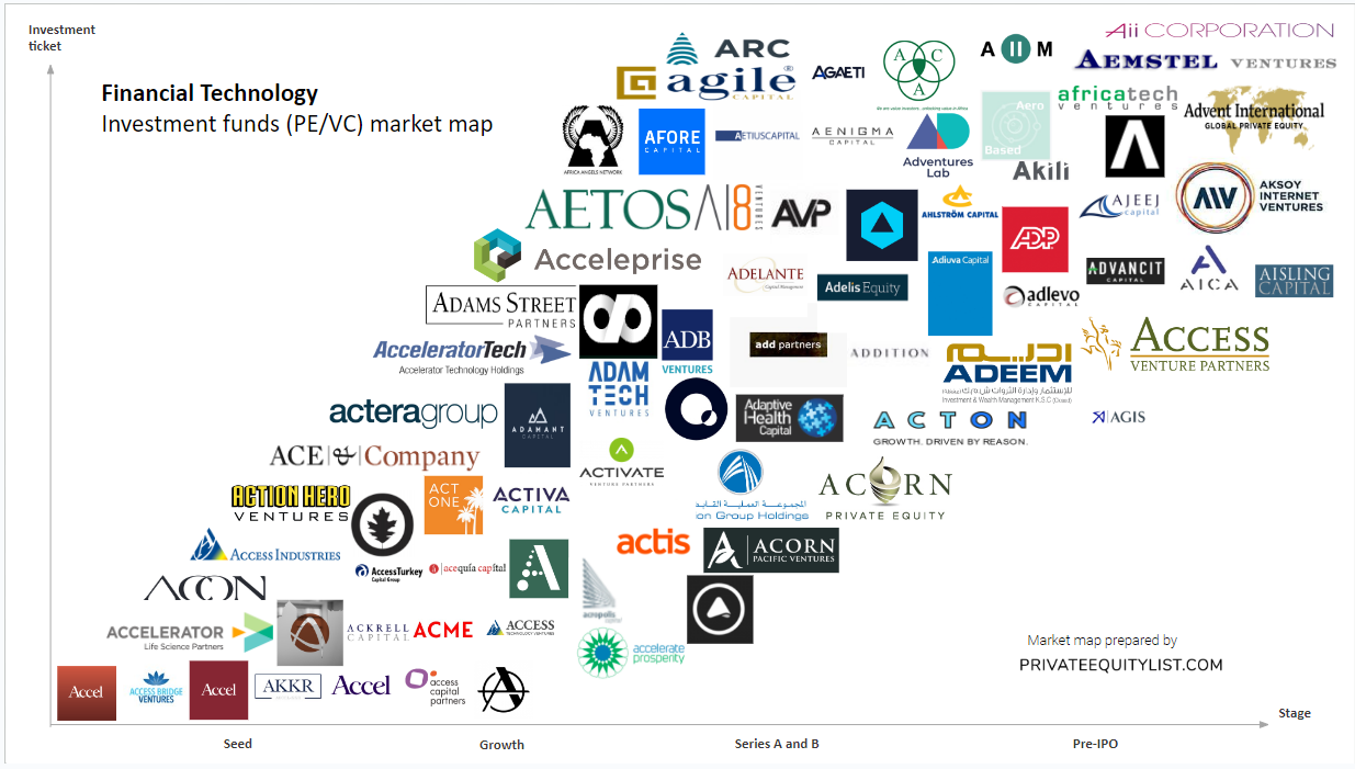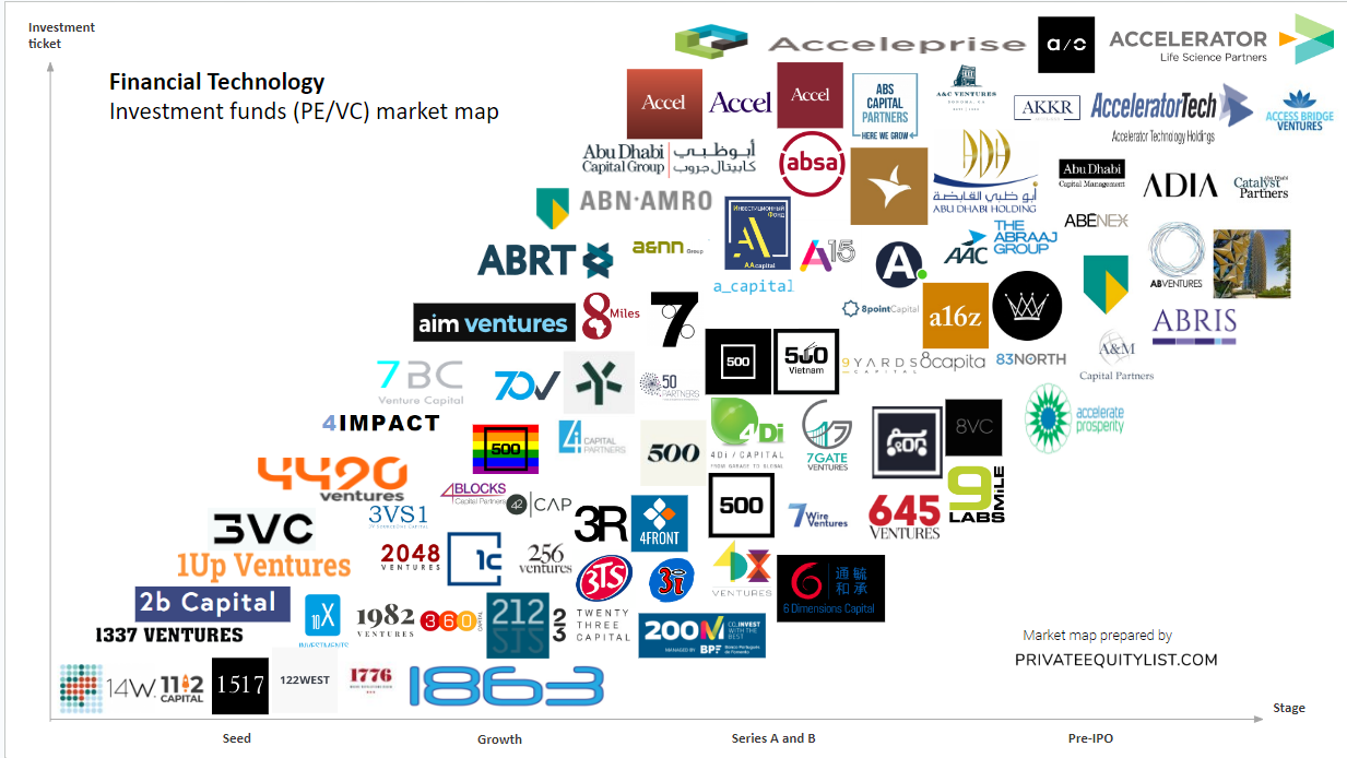We compiled an extensive FinTech private equity (PE) and venture capital (VC) market map that shows key FinTech investors and investment funds. We hope this is useful for your startup fundraising. Find below the list of investors from the market map and links to their websites.