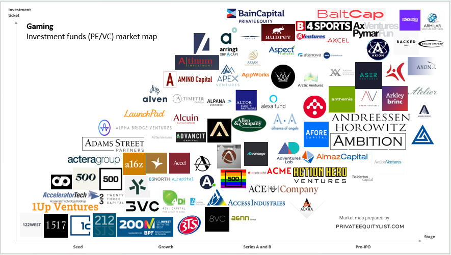 We compiled an extensive Gaming private equity (PE) and venture capital (VC) market map that shows key Gaming investors and investment funds. We hope this is useful for your startup fundraising. Find below the list of investors from the market map and links to their websites.
