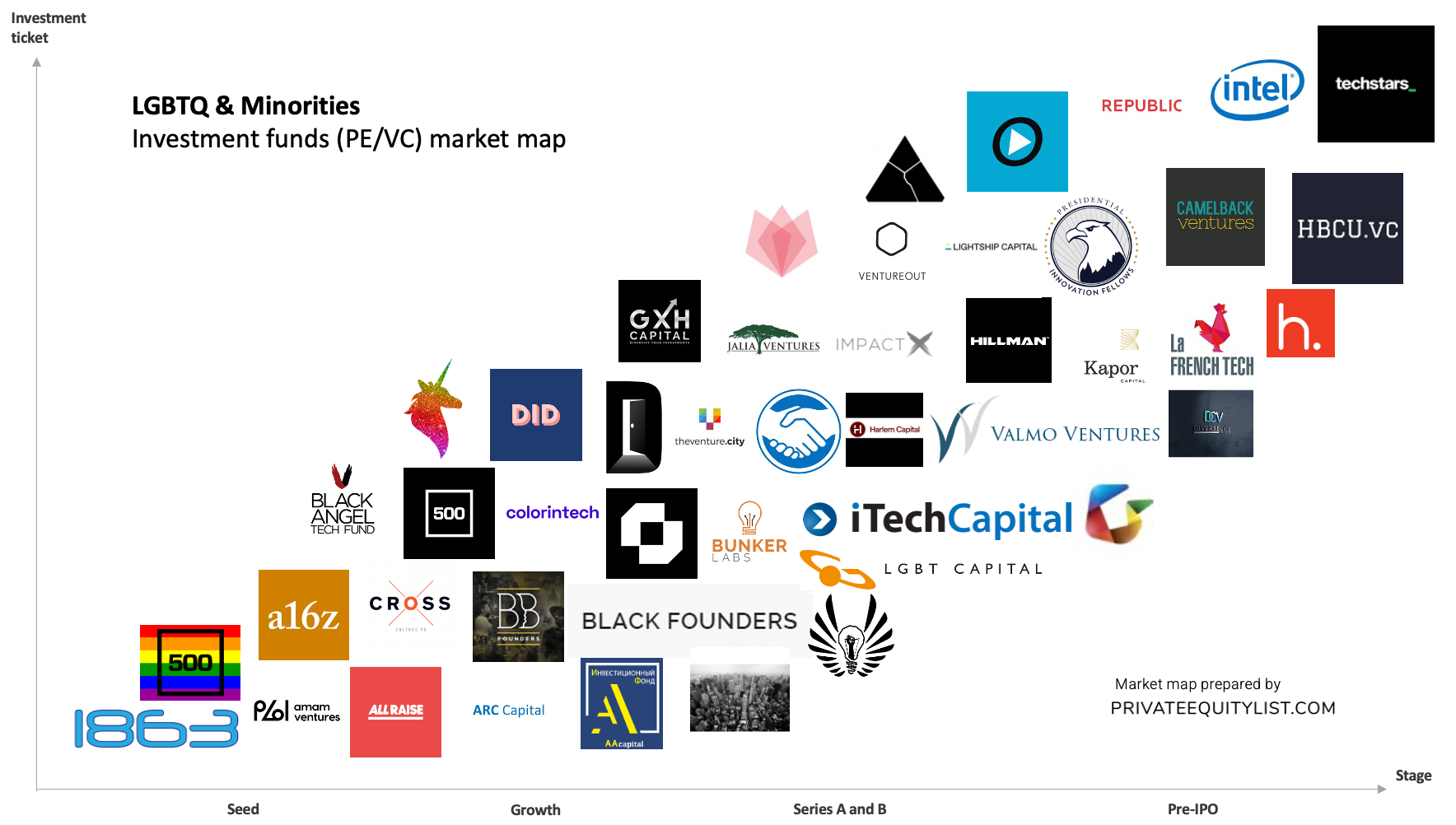 We compiled an extensive LGBTQ & Minorities private equity (PE) and venture capital (VC) market map that shows key LGBTQ & Minorities investors and investment funds. We hope this is useful for your startup fundraising. Find below the list of investors from the market map and links to their websites.