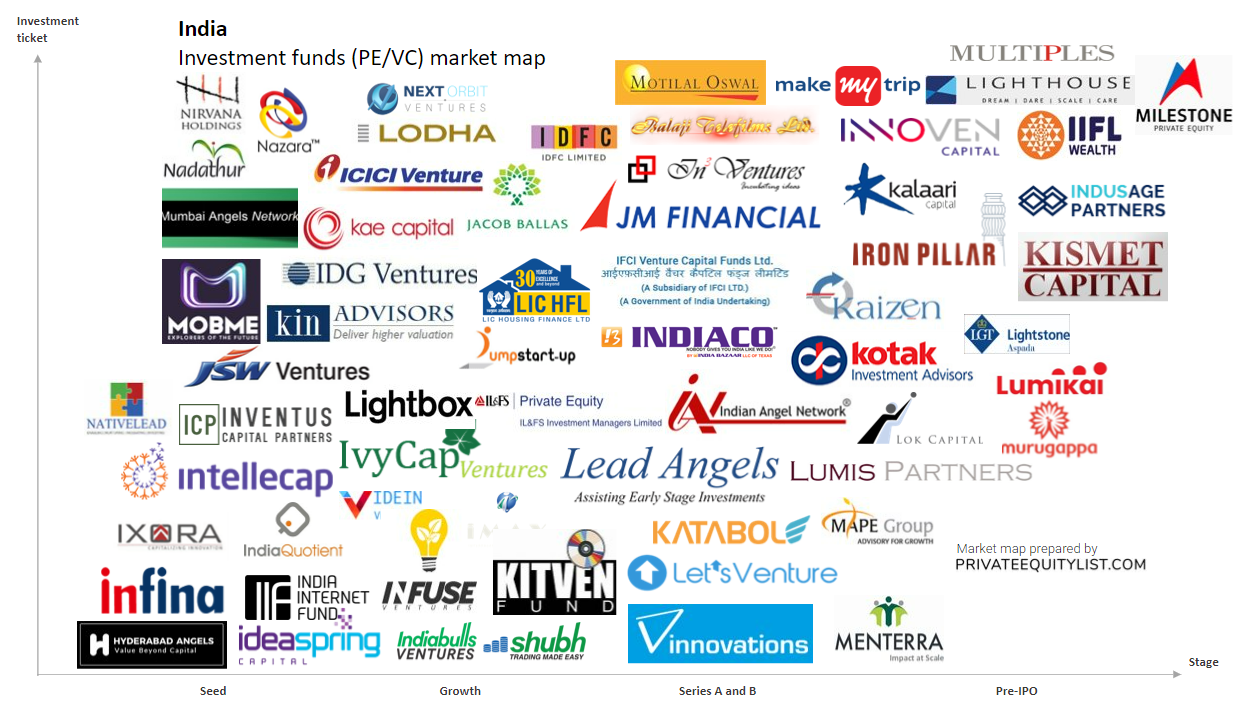 We compiled an extensive India private equity (PE) and venture capital (VC) market map that shows key Indian investors and investment funds. We hope this is useful for your startup fundraising. Find below the list of investors from the market map and links to their websites.
