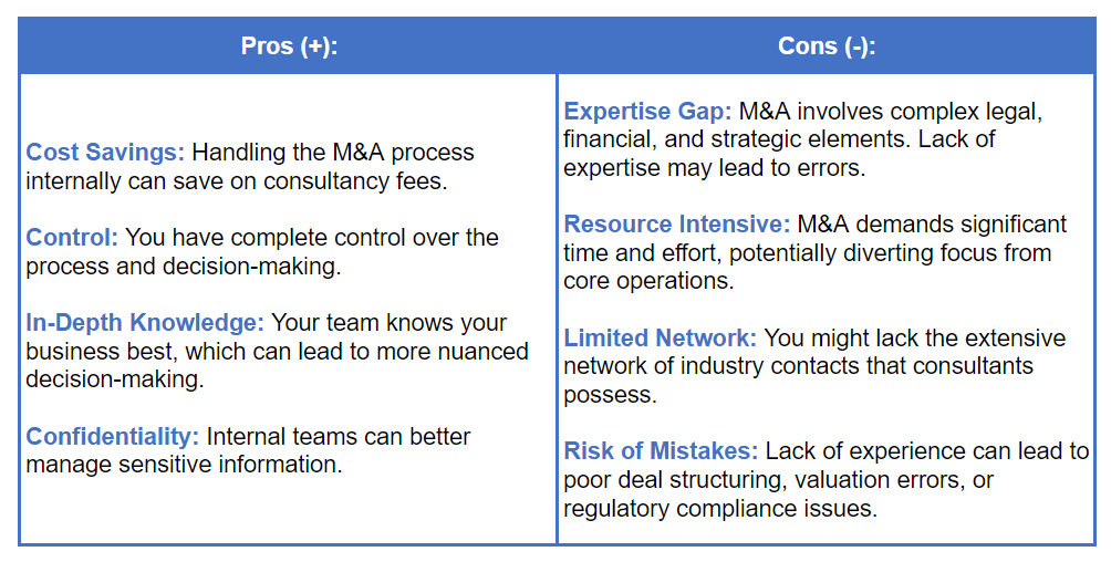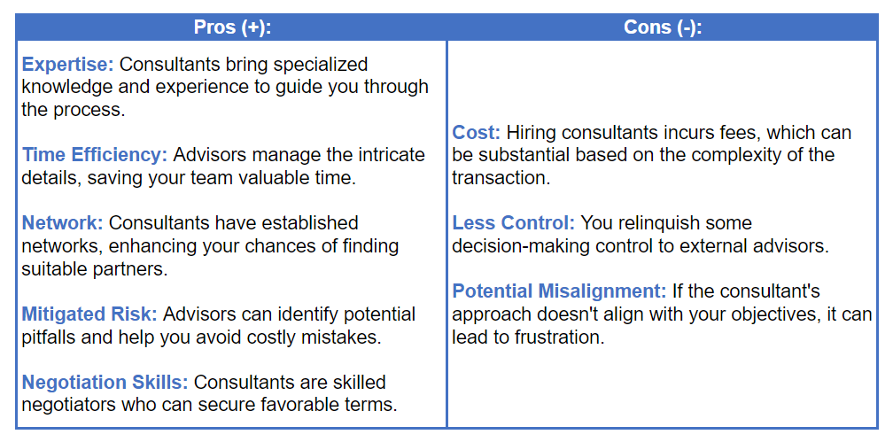 - Consultants: Hiring advisors is beneficial if you lack the necessary expertise or if the deal is particularly complex. Consultants provide guidance, connections, and a structured process that can increase your chances of a successful outcome, making it a wise choice for smaller businesses or those new to M&A.