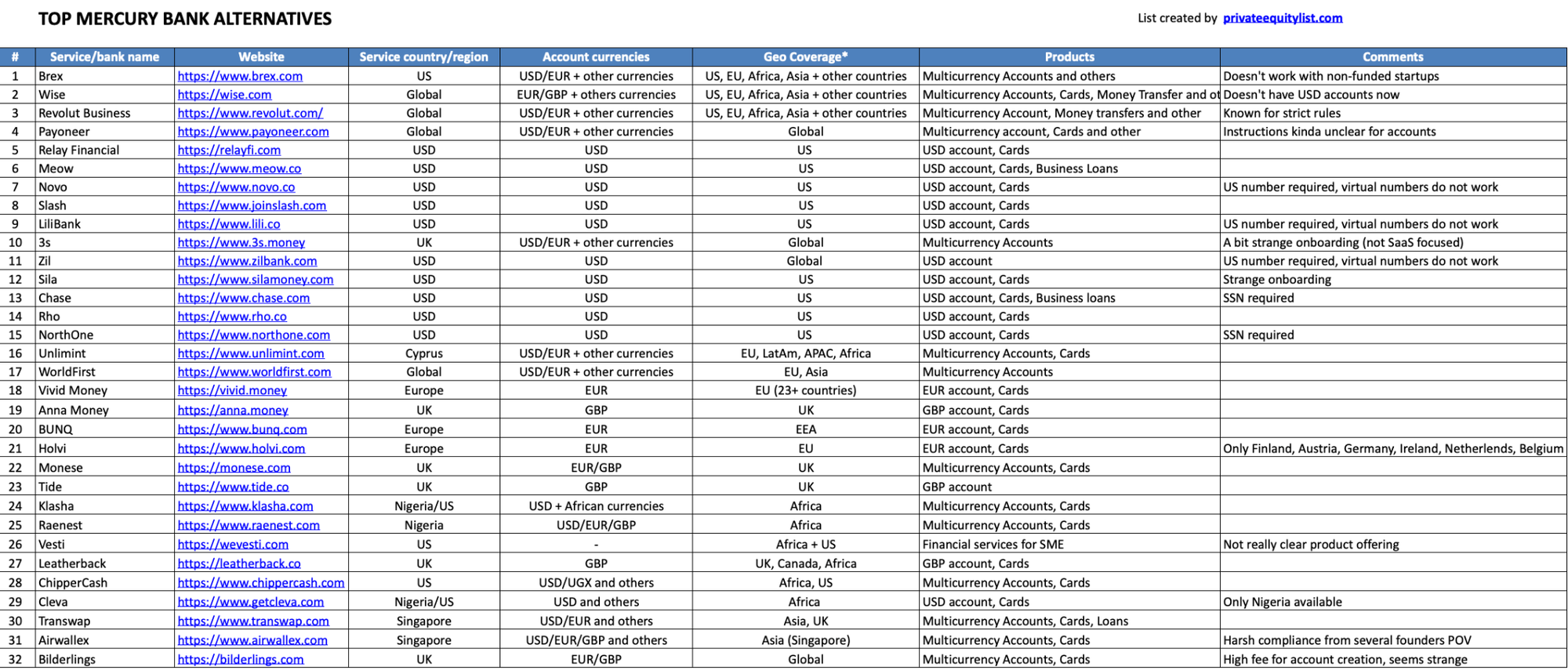 Below is a handpicked list of key alternative banks that can replace Mercury and Brex (though Brex is on the list too as it is still an alternative to Mercury if company is professionally funded). The list can be longer and fintech is an everchanging segment with new players arising.